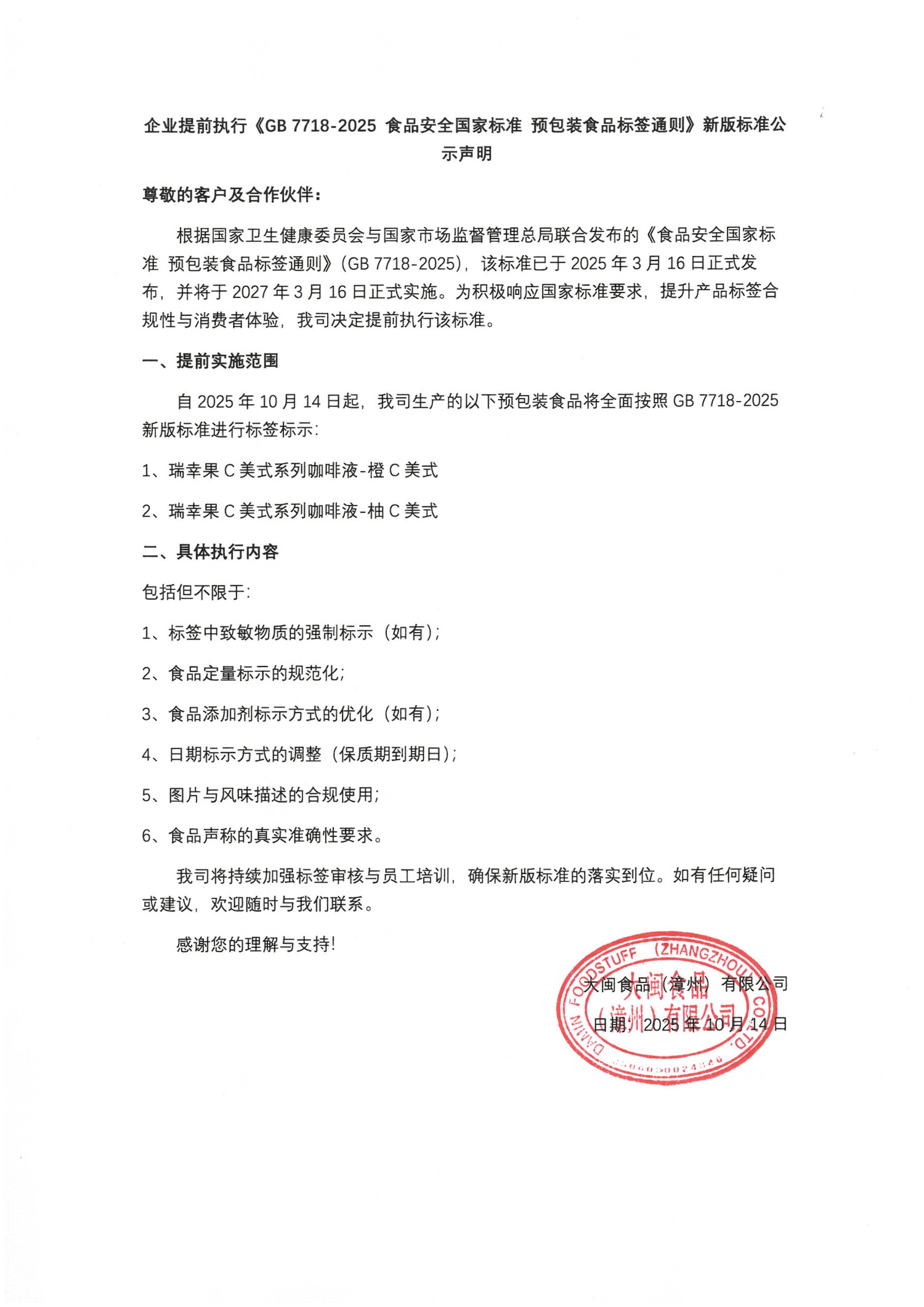 企业提前执行《GB 7718-2025 食品安全国家标准 预包装食品标签通则》新版标准公示声明